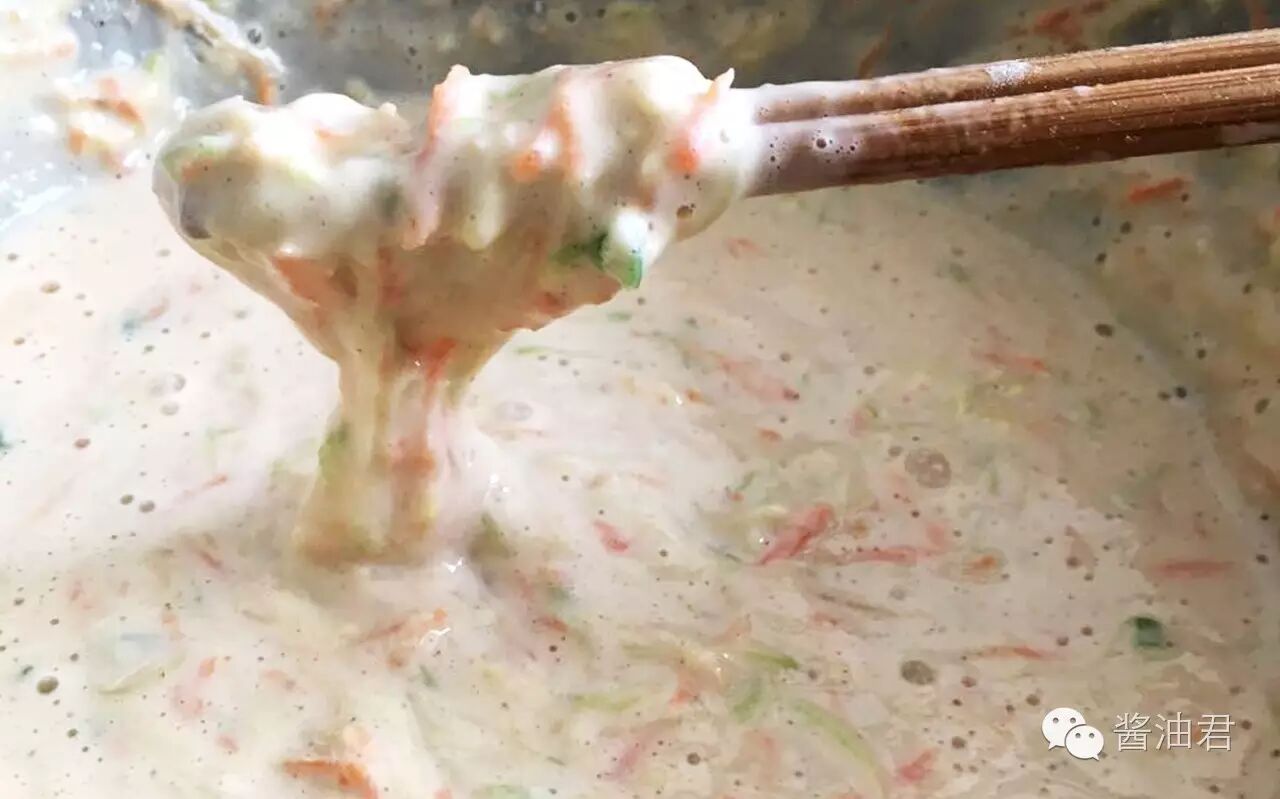 4.一边慢慢加面一边搅拌,到用筷子捞起蔬菜,有黏黏的粘连感,带起的面糊连续缓慢向下流,不滴落为止