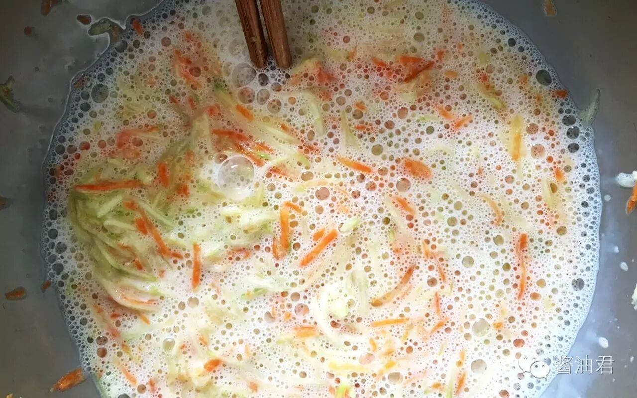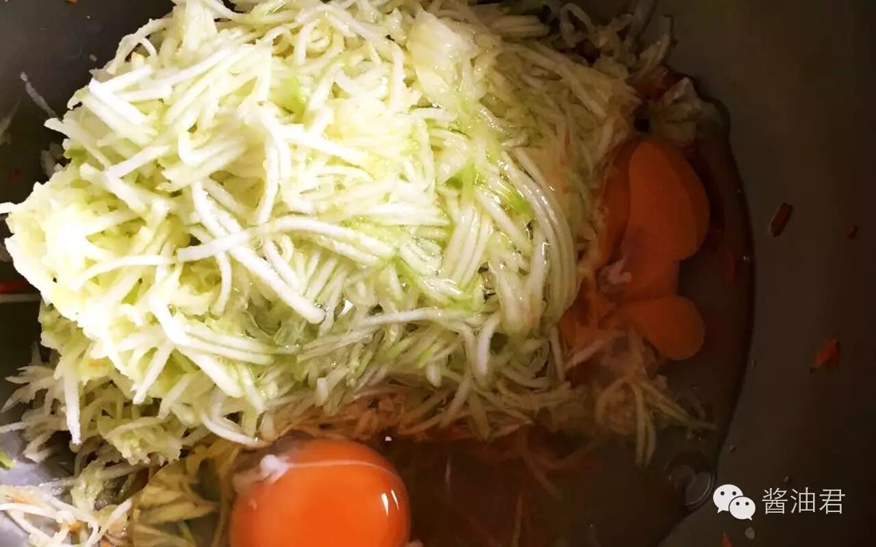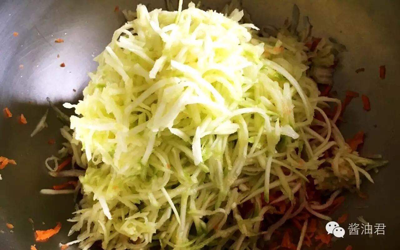 Tipps1. 丝弄得越细口感越好 2. 只用牛奶不加水可以上饼的口感更软嫩细腻,还有淡淡的奶香味 3. 面糊的稠度很重要,太稀不好成型,太稠饼就会变硬,影响口感。第一次烙可以先放一点面糊在锅里,看看效果,稀了加面,稠了加奶。当然手残党有可能加着加着就一大盆了哦 4. 每次倒入锅里面糊的多少决定饼的薄厚和翻面的难易,翻面的过程决定最后饼的颜值哦。酱油君一般厚度控制在30-40mm,像上面说的材料一次能烙四五张。 5. 喜欢焦味的童鞋可以多烙一会,至表面出现深黄色的硬皮,不过容易糊,吃糊的东东对身体有害哦。