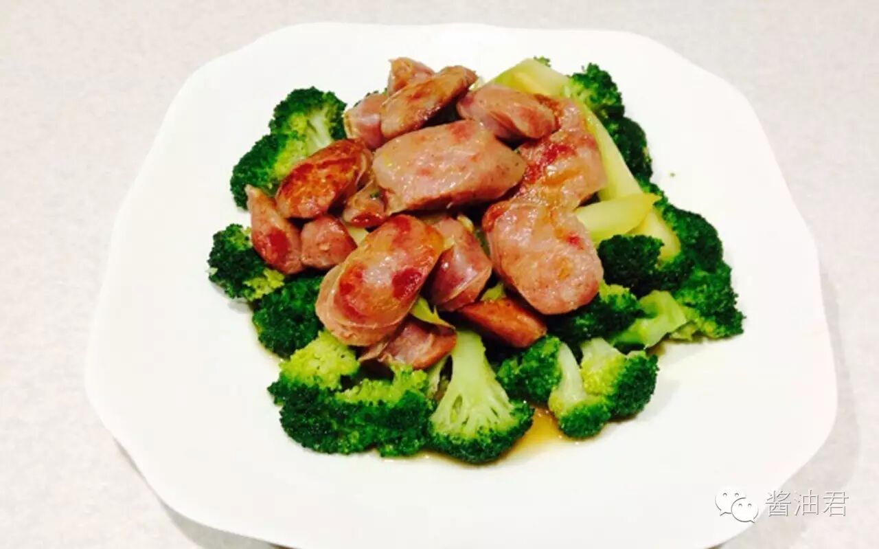 香煎香肠配西兰花材料:香肠,西兰花 做法: 1.将西兰花用开水烫熟 2.热锅,放入黄油 3.待黄油完全融化,放入香肠,中火煎至表面变成泛着油亮光芒的脆皮,盛入盘中 4.不要洗锅,直接放入西兰花翻炒,让其吸收锅里残余的黄油和肉香。然后盛出来,美美哒摆在香肠旁边