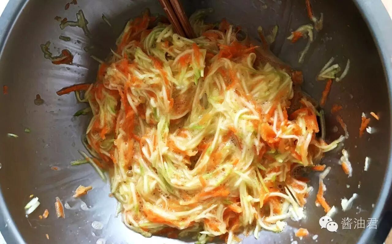 营养蔬菜饼材料(两人份): 西葫芦1根,胡萝卜1-2根,鸡蛋2颗,面粉,牛奶,葱花,盐,五香粉,植物油 做法: 1.将西葫芦、胡萝卜洗净,削皮,擦成细丝放于大碗或小盆中