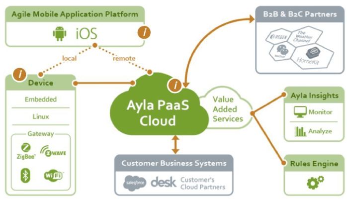 Ayla敏捷物联网平台主要包含三大组件:Ayla嵌入式模块、Ayla云服务、以及Ayla应用程序库。这是一套完整的解决方案,让几乎任何设备都能够连接到云端和App;还包含了优质的工具和服务,让制造商可以对设备进行管理、配置以及分析。Ayla让制造商在打造物联网产品时,无需投资到网络堆栈开发、端到端安全、云服务以及其他基础技术工作,而是将资源投入到他们所擅长的专业领域中。