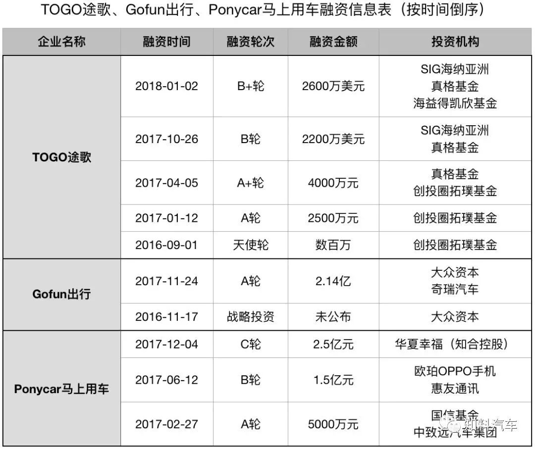 伴随共享单车火热,2017年下半年开始,共享汽车也开始受到资本关注。2017年下半年以来,共享汽车融资明显加码。其中,PonyCar、Gofun、TOGO途歌等共享汽车品牌新一轮融资的金额都突破一亿人民币,PonyCar的C轮融资金额更是高达2.5亿人民币。据媒体数据统计,去年共享汽车融资近15亿元。