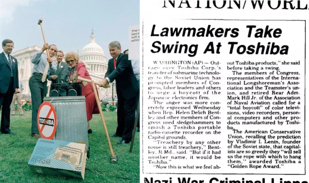 1987年爆发的东芝机械事件,更是把民间和国会山的已经汹涌起伏的反日情绪推向高潮。当有国会议员在国会大厦前拿着大锤轮流砸一台东芝的录放机。当时的议员竞选时只要玩命骂日本,喊口号抵制日货,就能当选,反日就是这些政客的灵丹妙药。