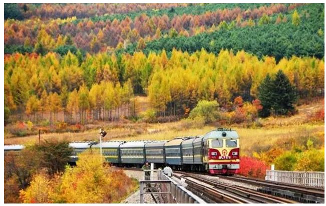 这一段铁路穿梭在长白山中几座雄伟的铁路桥横跨在层林尽染的山间简直就像是开往金色的秋日时光。