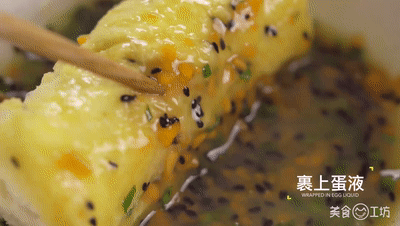 7. 锅中热少许油,将卷好的吐司裹上蛋液,放入锅中小火慢煎3分钟。
