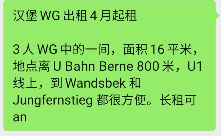 公寓情况: 该wohnung有大中小3个房间,网络 一体化厨房 卫生间 供暖 热水等配备齐全。出租其中一个房间,房间有基本家具: 床,床垫,书桌,书架等,可拎包入住。