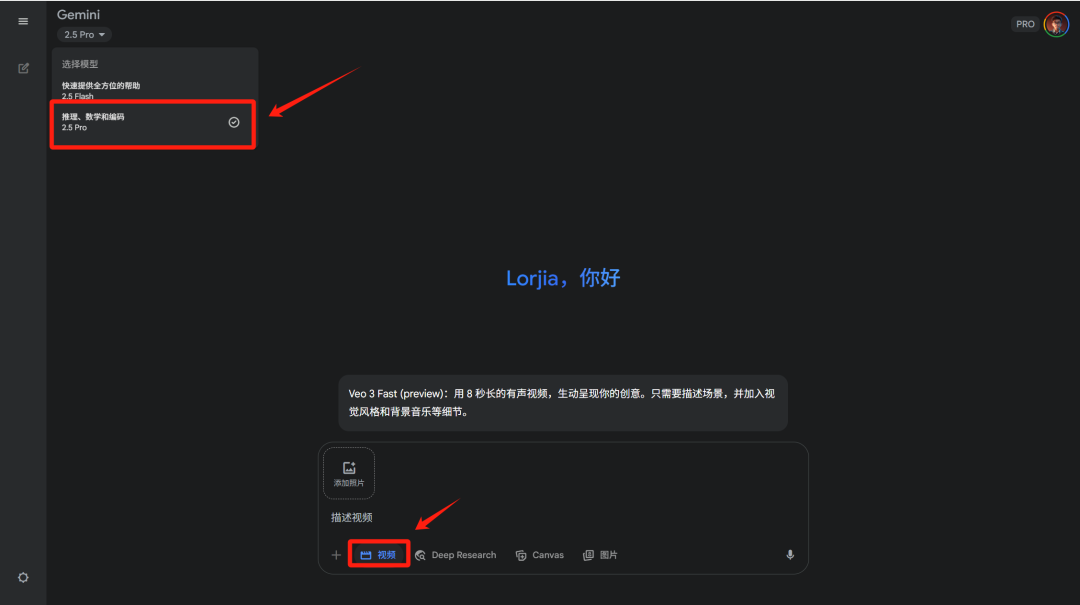 进入官网后,确保模型选择的是 「Gemini 2.5 Pro」,然后点击输入框下方的 「视频」 按钮,就能调用 Veo 3。