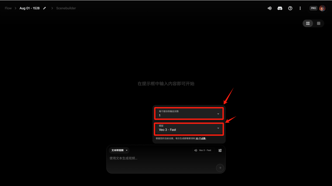 进入后,点击右下角设置按钮,将模型切换为 「Veo 3 - Fast (Text to Video)」,生成数量选 1 条,这样每次仅消耗 20 积分(省着点花 hh)