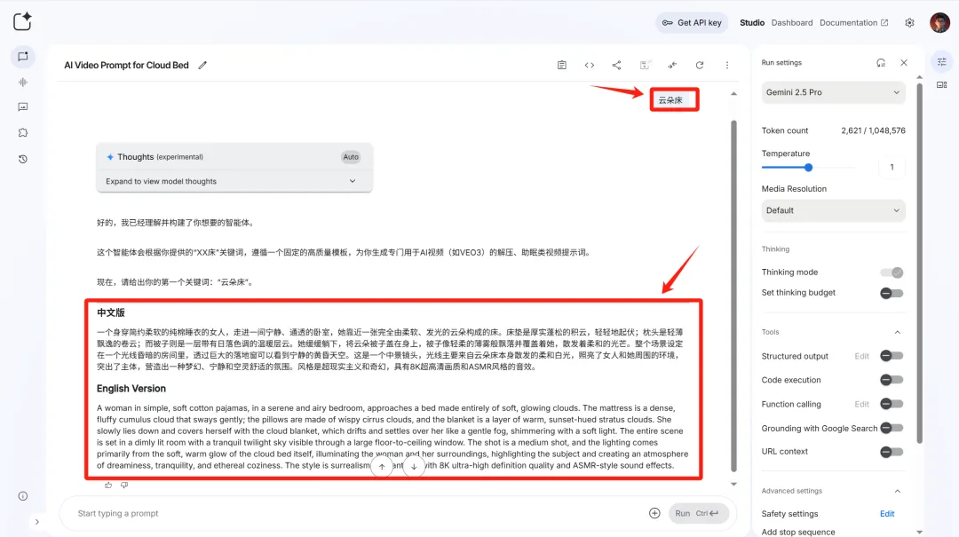 比如,我在输入框中输入“云朵床”,AI很快就会帮我生成一条Veo3生成视频的提示词,而且还是中英文版本的,非常贴心。
