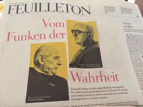 近日,年事已高、很少在媒体露面的德国著名学者尤尔根·哈贝马斯在德国《时代报》(DieZeit)上撰文,深情记述了阿多诺和肖勒姆两人交往情景,并称这是“德国—犹太思想史的一个伟大时刻”。哈贝马斯对二人都很了解:1956年,在法兰克福的社会研究所,他是阿多诺的助手和最重要的学生;1970年代初,哈贝马斯及其夫人同肖勒姆夫妇订交。