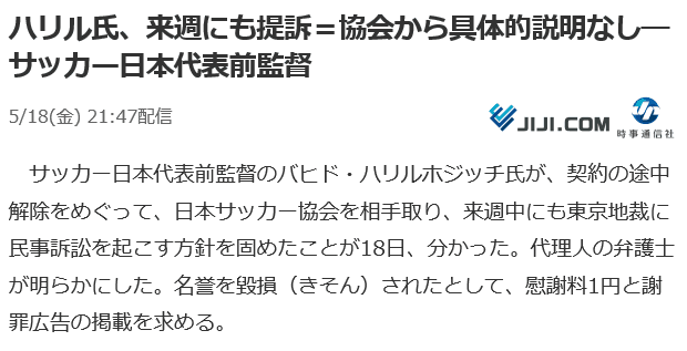 [其它] 哈利霍季奇下周状告日本足协 要求赔偿1日元道歉 |