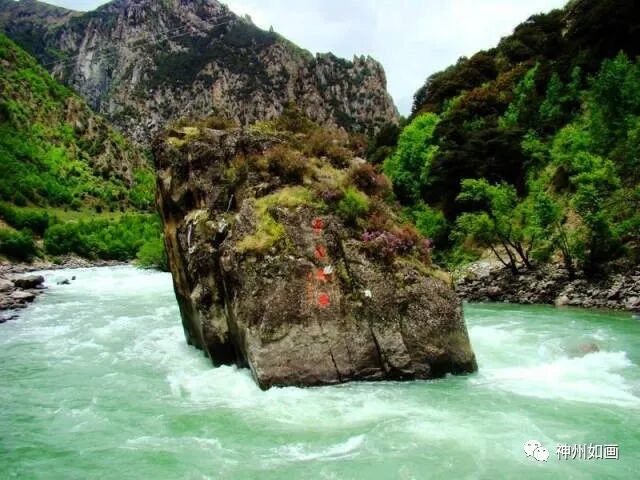 “中流砥柱”位于尼洋河中游,其所处在的位置山势险峻,陡象横生。石柱上长着一棵松树,并有多种植被装点,远处眺望,甚为壮观。
