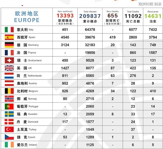 欧洲感染人数超过20万人;死亡人数达到11092人。