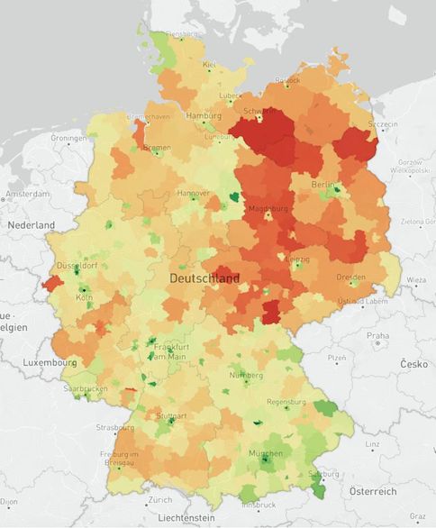 行动代表一切!对比3月16日和3月23日的移动数据分析,德国人减少了31%的活动。图中绿色代表活动减少最多49%,橙红色代表减少活动最少13%。