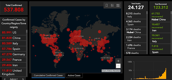 根据约翰·霍普金斯大学在线统计数据,新冠病毒已经造成24127人死亡。专家估计,没有记录在案的实际数字可能更高。到目前为止全球已有537808人感染了Sars-CoV-2病毒,当然,这个数据也存在很多没有计入统计的缺憾。