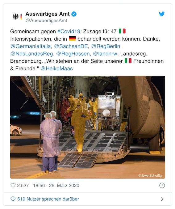 巴伐利亚州长Söder指责以冯德莱恩的欧盟团队在关键时刻无所作为。“本来这应是欧盟大有作为的时刻,但是布鲁塞尔方面却出奇的宁静。我们不仅需要考虑民族国家,还必须组织为意大利和西拔牙实施救援。这是欧洲议程的重中之重。” 还有关于边境交通的问题也是,现在全部需要通过双边协商解决。