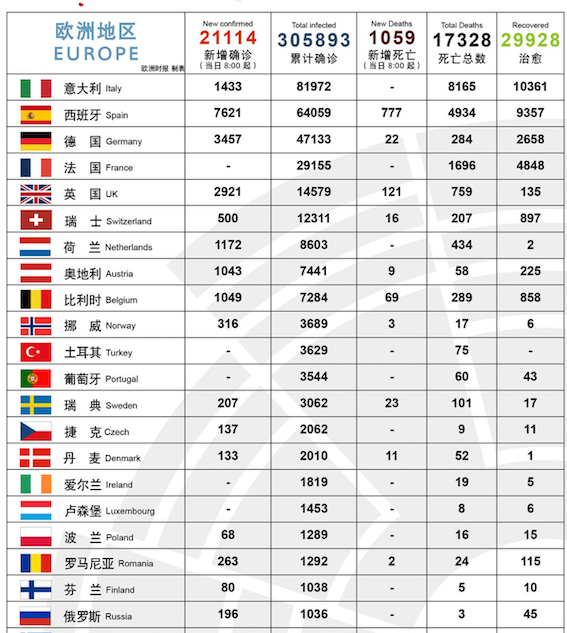 上图是截取欧洲时报统计数据中确诊感染超过1000例的欧洲国家