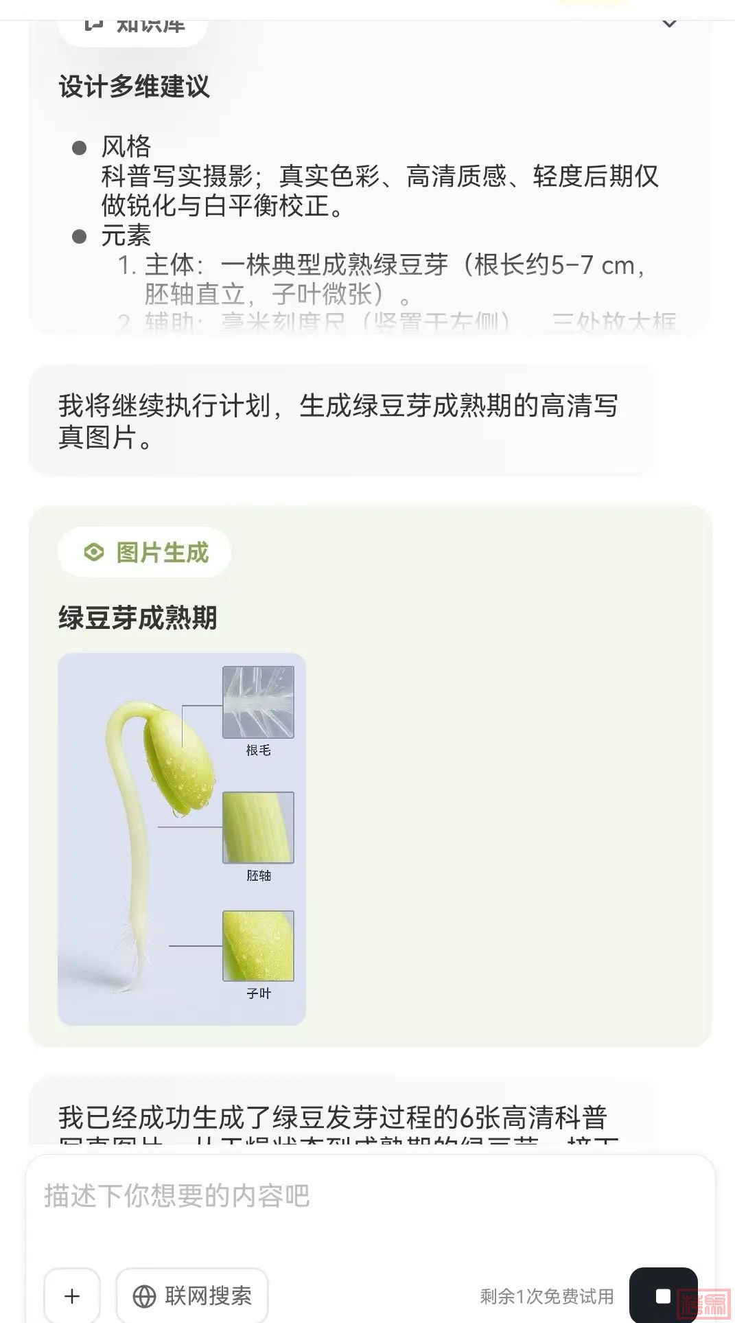 在星流app里,我直接在对话框中,输入:帮我生成一个从绿豆到绿豆芽的科普视频,高清写真,时长30秒。