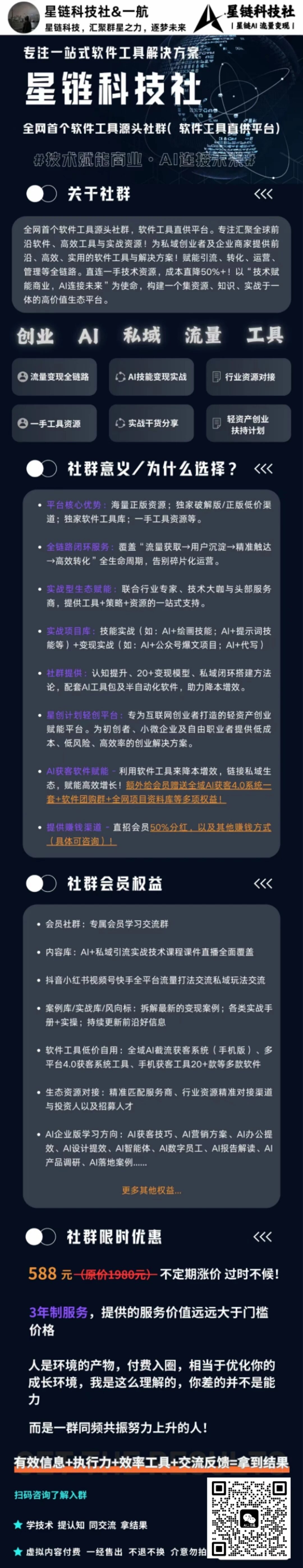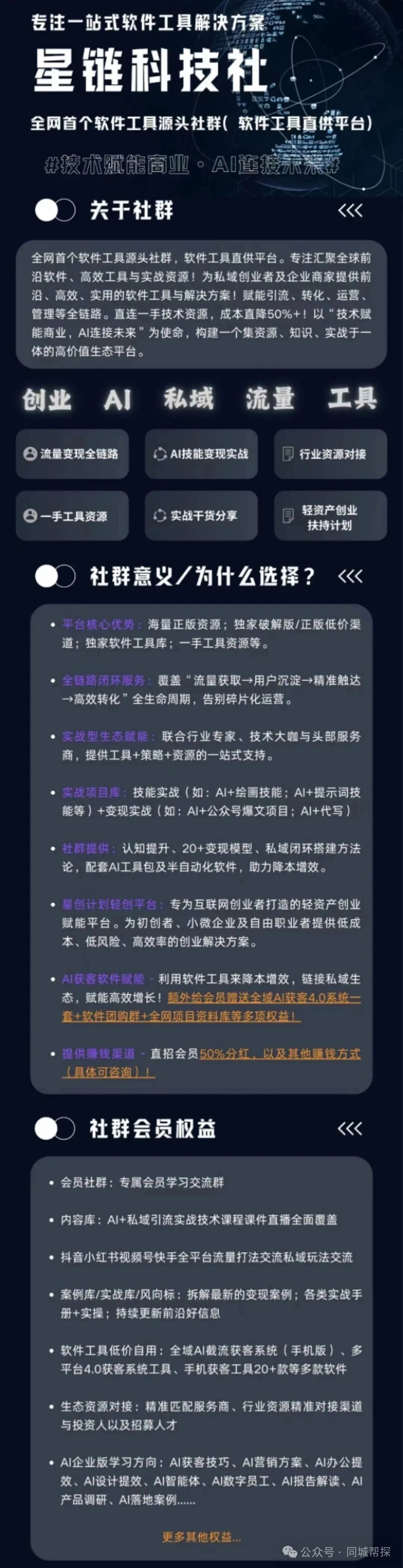 AI软件工具的拼多多:AI时代引流获客的流量源头供给站,全网首创AI软件获客工具社群,让每个行业都能快速高效触达客户. |