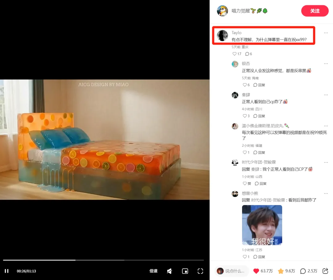对了,还有一个非常有意思的现象。我用手机看这条视频时,发现满屏的弹幕清一色地在刷“99”。