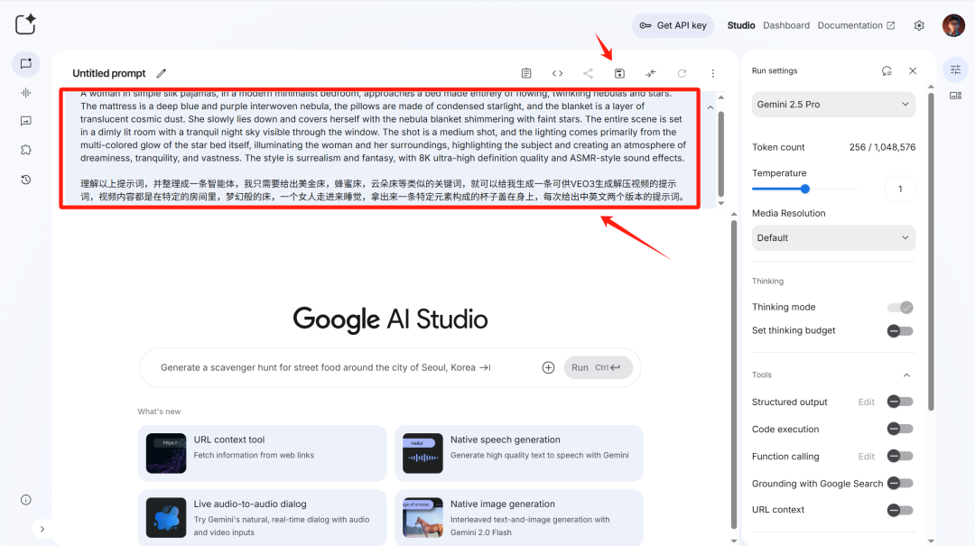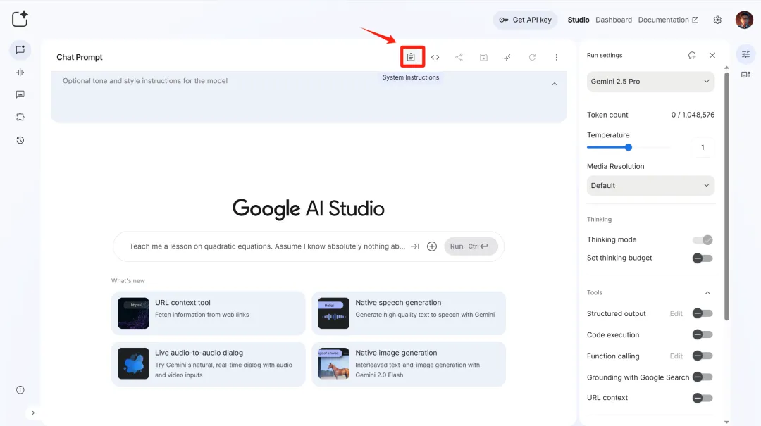 Google AI Studio 的一个强大之处在于,可以像配置智能体一样,预设好“系统指令”。