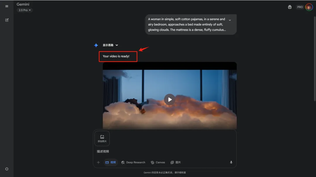 我们只需要在对话框输入想制作的“床”关键词,AI就会帮我直接生成一段Veo3的视频提示词。