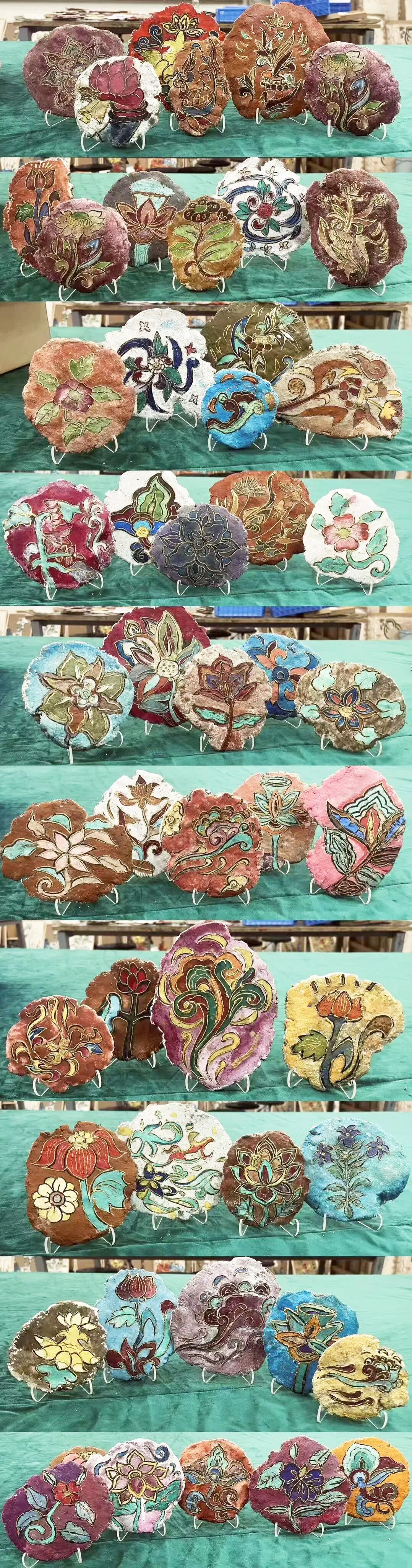 The weathered texture of the clay tablets, paired with the naive yet expressive floral motifs, embraces ancient charm and childlike innocence. This not only showcases the creative transformation of traditional craftsmanship and local resources but also achieves a harmonious coexistence between Eastern aesthetic spirit and Western artistic techniques.