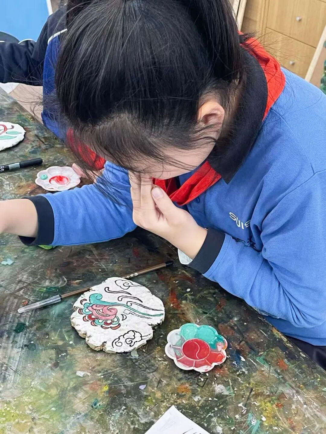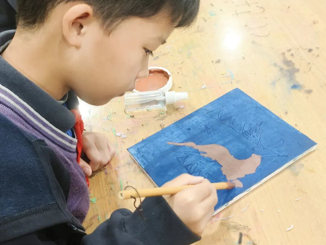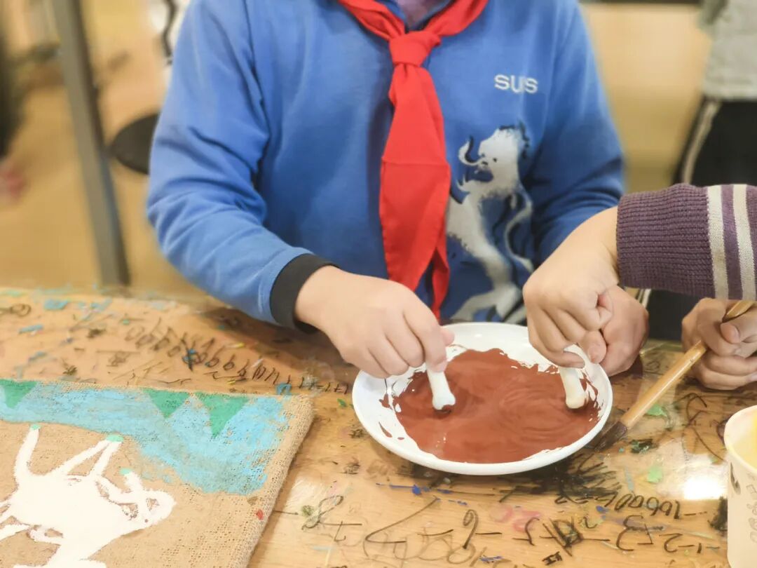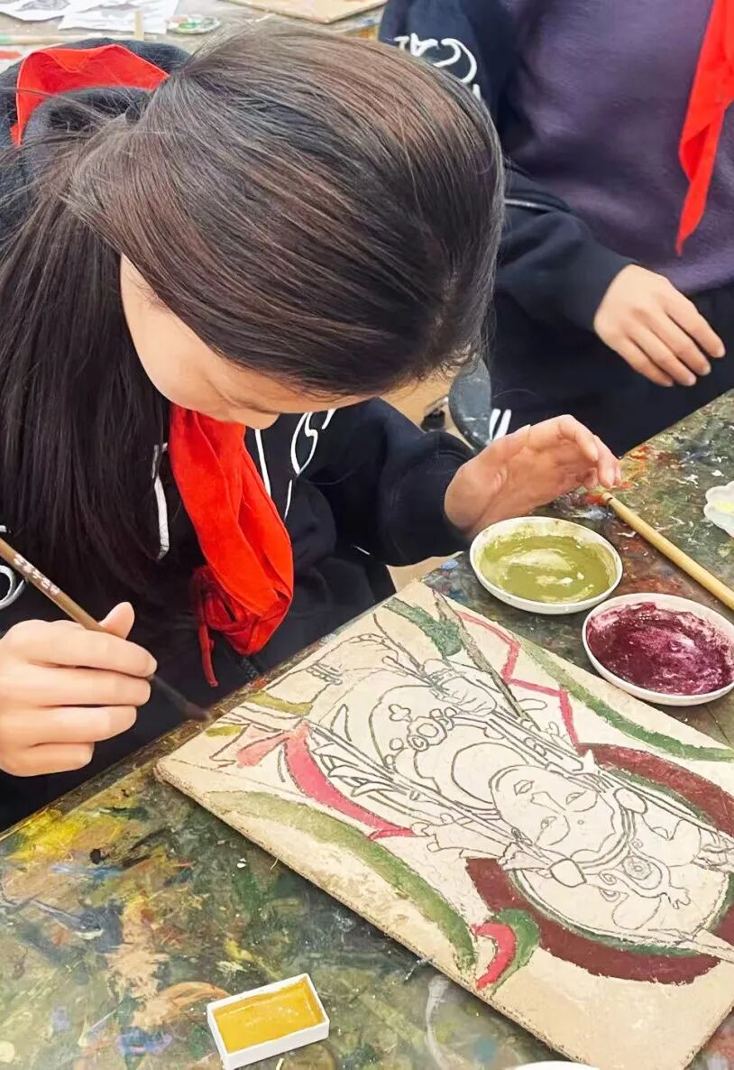 The Dunhuang Floral and Botanical Motif Clay Panel Mural, a collaborative creation by all P4 pupils, represents a remarkable fusion of local heritage and Silk Road civilisation, serving as a tangible embodiment of the concept of “Developing in Harmony”. During the preliminary creative phase, geography and fine arts disciplines were deeply integrated: teachers and students collected local Hefei clay in the field, analysing its adhesive properties and fineness, comparing it against the material composition of the ground layer in Dunhuang murals, and drawing inspiration from the creative approach of land art within contemporary Western art. Through repeated experimentation and proportioning, they ultimately transformed the rustic Hefei clay into an exceptional medium for bearing millennia-old patterns.