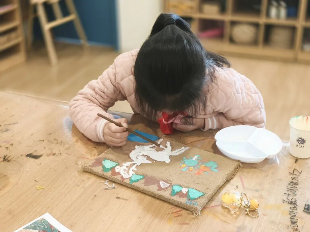 当矿物粉末调和的颜料层层晕染,传说中身披七彩霞光的神鹿跃然纸上,岩彩独有的晶亮光泽流转闪烁,恰似为神鹿缀上了一件由石头编织的华裳。这份将文学、科学、美术融为一体,兼具东方意境与西方科学探究精神的创作,正是对“融合中西 和谐发展”办学理念的生动诠释,也呼应了“一带一路”倡议中“文明互鉴”的核心精神。