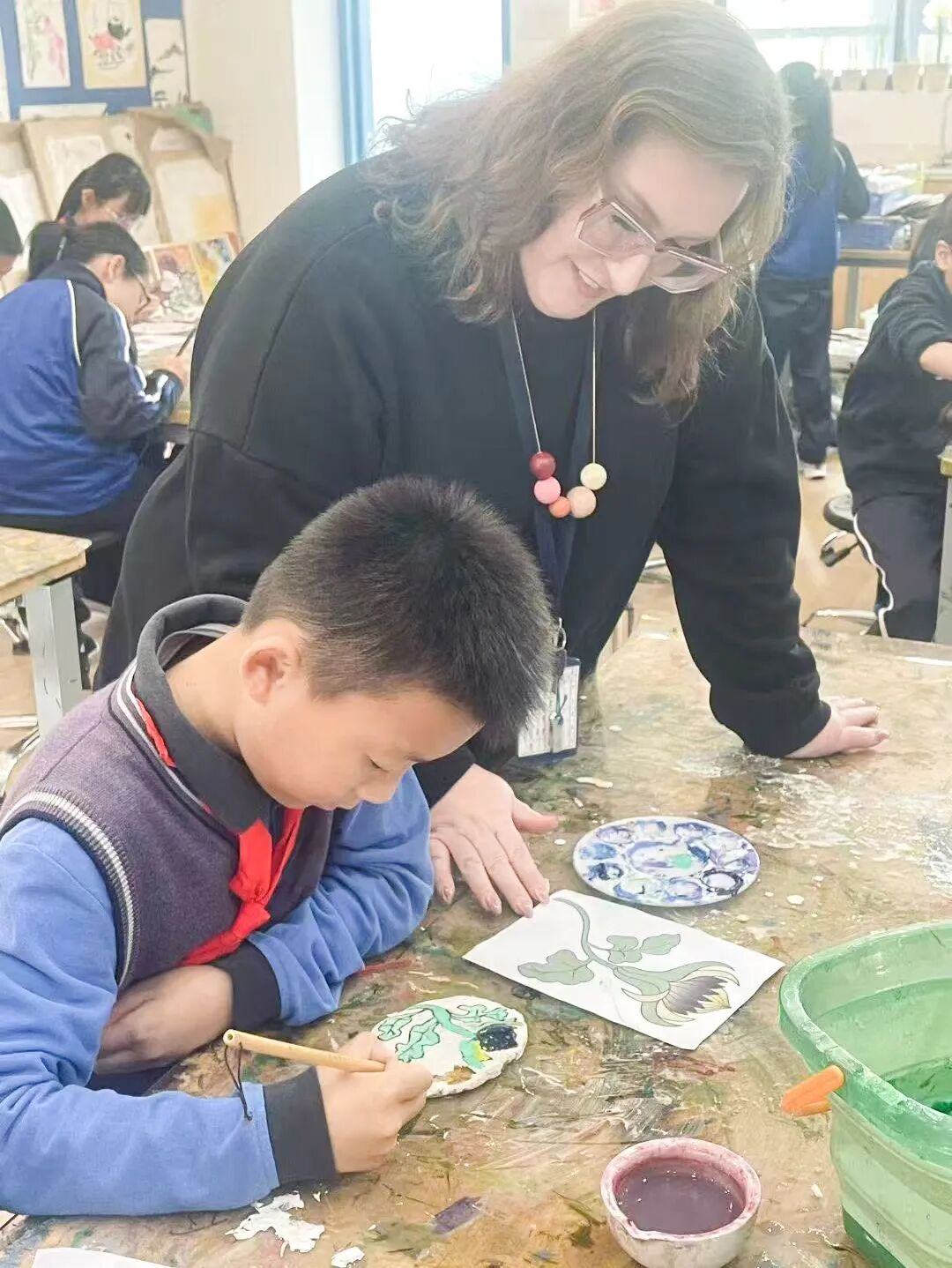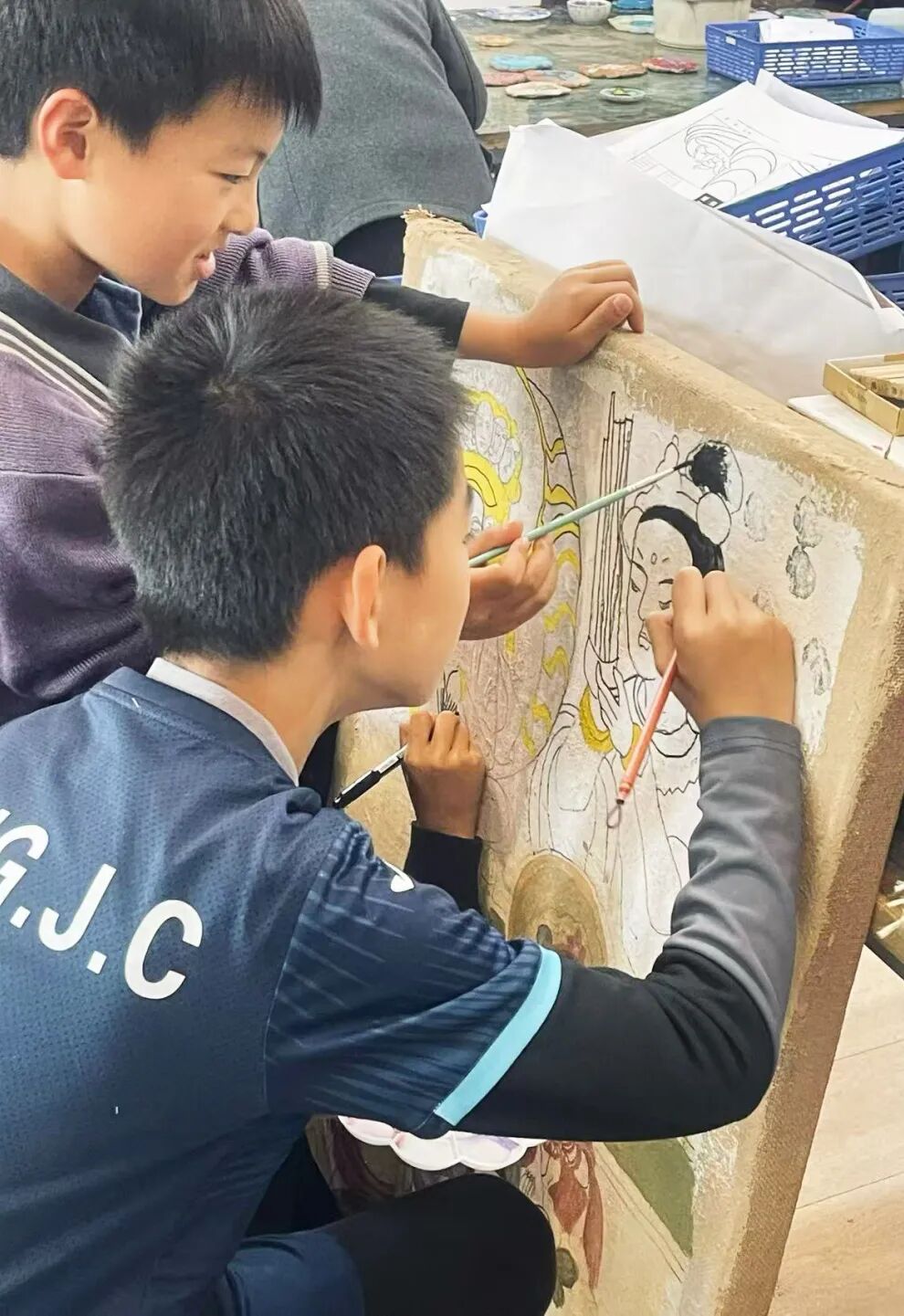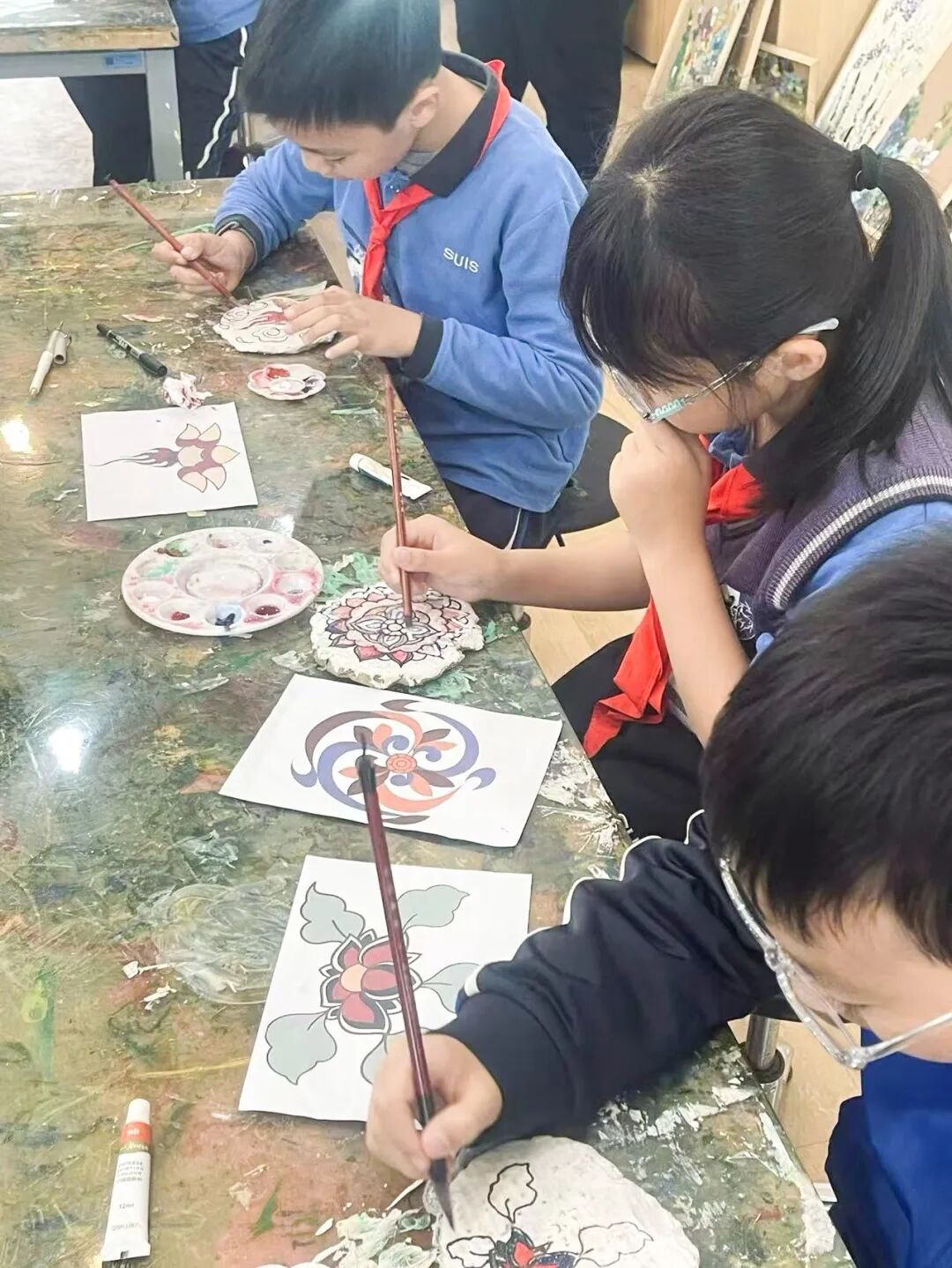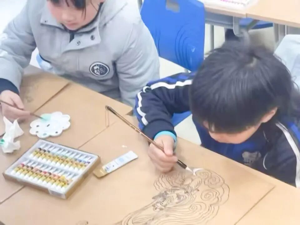 四年级全体学生共创的《敦煌花草纹样泥板壁画》,则是乡土情怀与丝路文明的奇妙碰撞,更是“和谐发展”理念的具象表达。创作前期,地理与美术学科深度融合:师生们实地采集合肥本地黏土,分析其黏性、细腻度等特性,对比敦煌壁画地仗层的材质密码,更参考西方当代艺术中大地艺术的创作思路,反复试验调和比例,最终让质朴的合肥黏土成为承载千年纹样的绝佳载体。美术课堂上,同学们循着敦煌壁画中的卷草、忍冬、宝相花等经典东方纹样,以灵动线条勾勒描摹,以矿物颜料填色晕染。