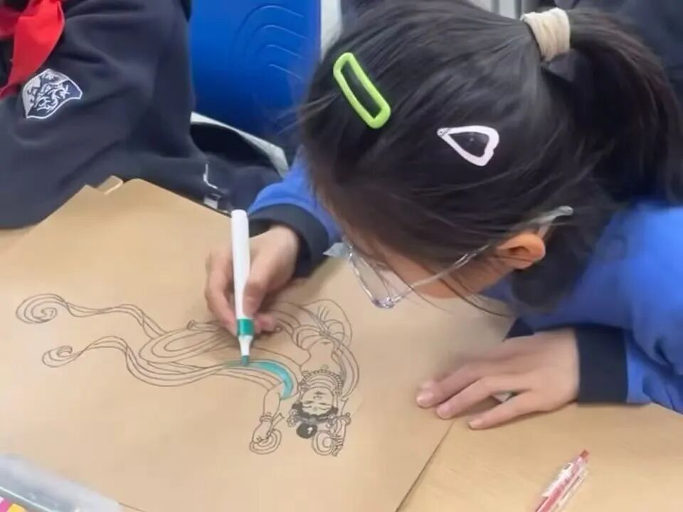 As the crowning glory of the special exhibition, the five scrolls depicting celestial maidens, collaboratively created by P4 pupils, brought cultural heritage to its zenith, fully showcasing the educational ethos of “East meets West”. Prior to creation, teachers and students traced the evolutionary trajectory of the flying apsaras imagery in class, exploring the profound influence of the Silk Road on the dissemination of Eastern and Western art. Within the specialised study of Dunhuang scholarship, participants interpreted the Eastern aesthetic essence encapsulated in the phrase ‘heavenly robes soaring, walls filled with wind-swept movement,’ gaining insight into Ms. Fan Jinshi's original aspiration in safeguarding Dunhuang. During the practical phase, students fused the delicate lines of Chinese fine brushwork, the rich texture of mineral pigments, and Western painting's techniques of light and shadow. This fusion allowed the flowing robes and ribbons of the flying apsaras to radiate an ethereal and dynamic grace.