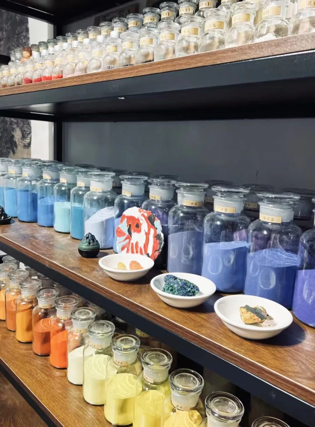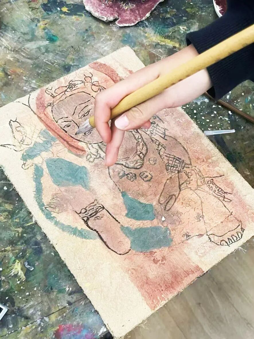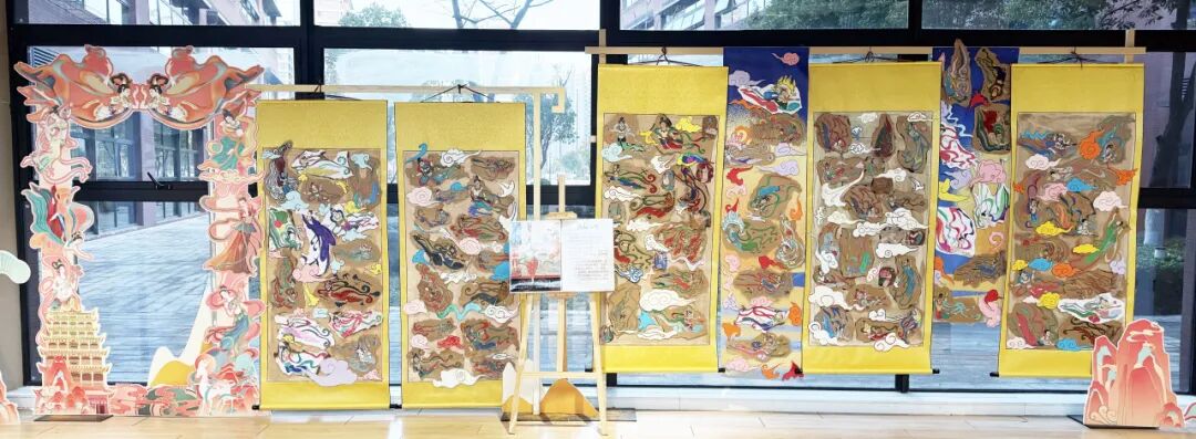 Upon entering the special exhibition, the nine-coloured deer rock pigment artwork by the school CCA's Rock Colour Club immediately captures attention. This marks a cultural exploration spanning disciplines and bridging Eastern and Western traditions. In the creative process, the students not only studied the Eastern fable of the Nine-Coloured Deer from Dunhuang manuscripts, which embodies the principle of ‘good deeds beget good rewards,’ but also drew upon Western artistic methodologies for exploring material textures. They delved deeply into the mysteries of mineral pigments—from analysing the chemical compositions of ores like hematite (ochre red) and malachite (emerald green), to restoring traditional techniques for grinding, sieving, and and traditional glazing techniques. Each step embodies reverence for Dunhuang art while showcasing the collision and fusion of Eastern and Western artistic thought.